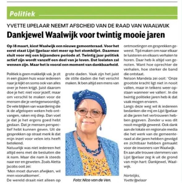 Nu als volgende stap: fractievolger voor Lijst IJpelaar. Ik ben zelf van minder woorden en meer van doen en ik ben blij dat ik dit mag laten zien bij Lijst IJpelaar.